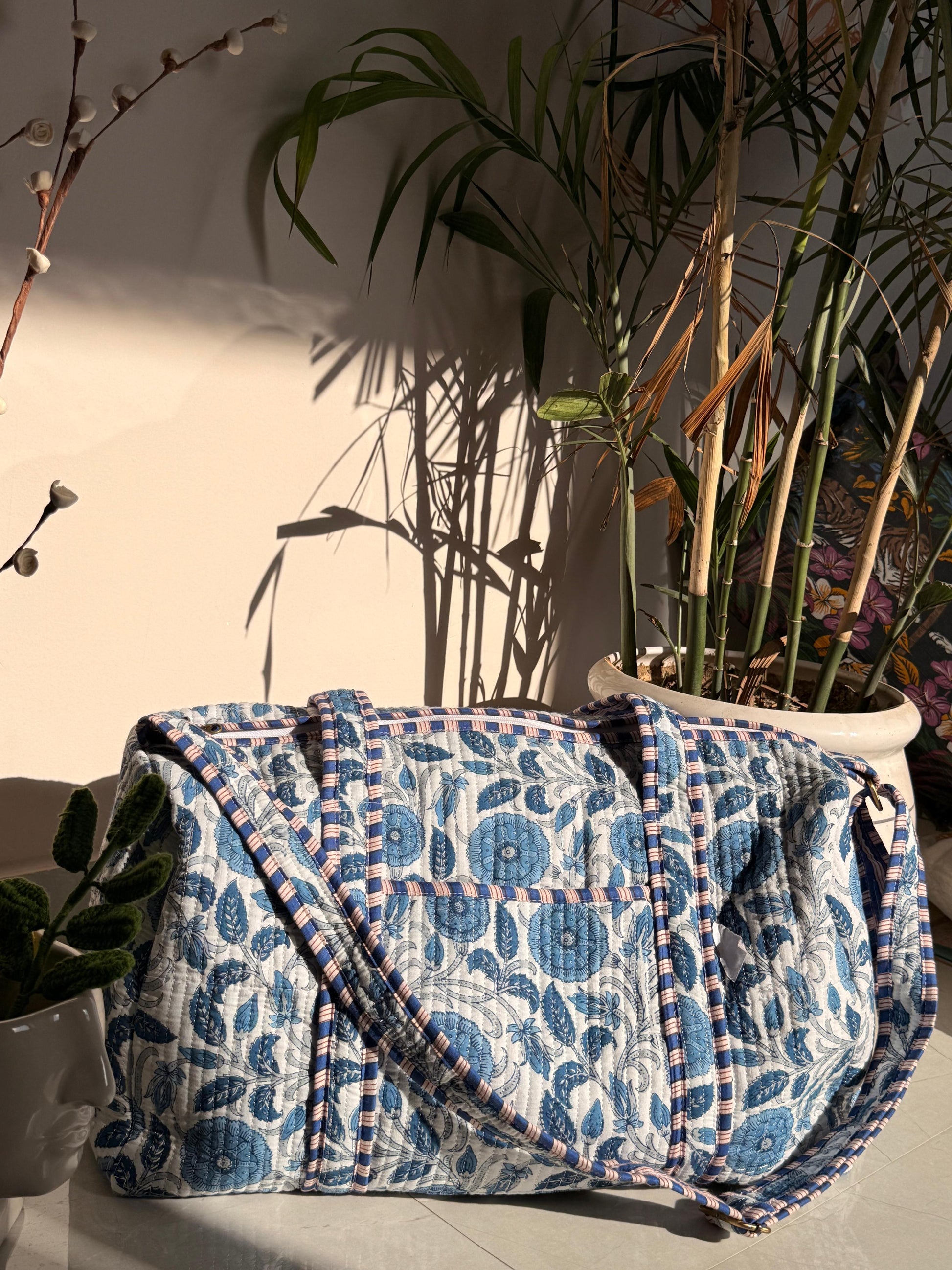 Cotton quilted travel Bag made by Indian Artisans, this cotton quilted shopping bag is totally unique and multi purpose. Use this for your grocery or as a travel bag. Perfect to suit all.