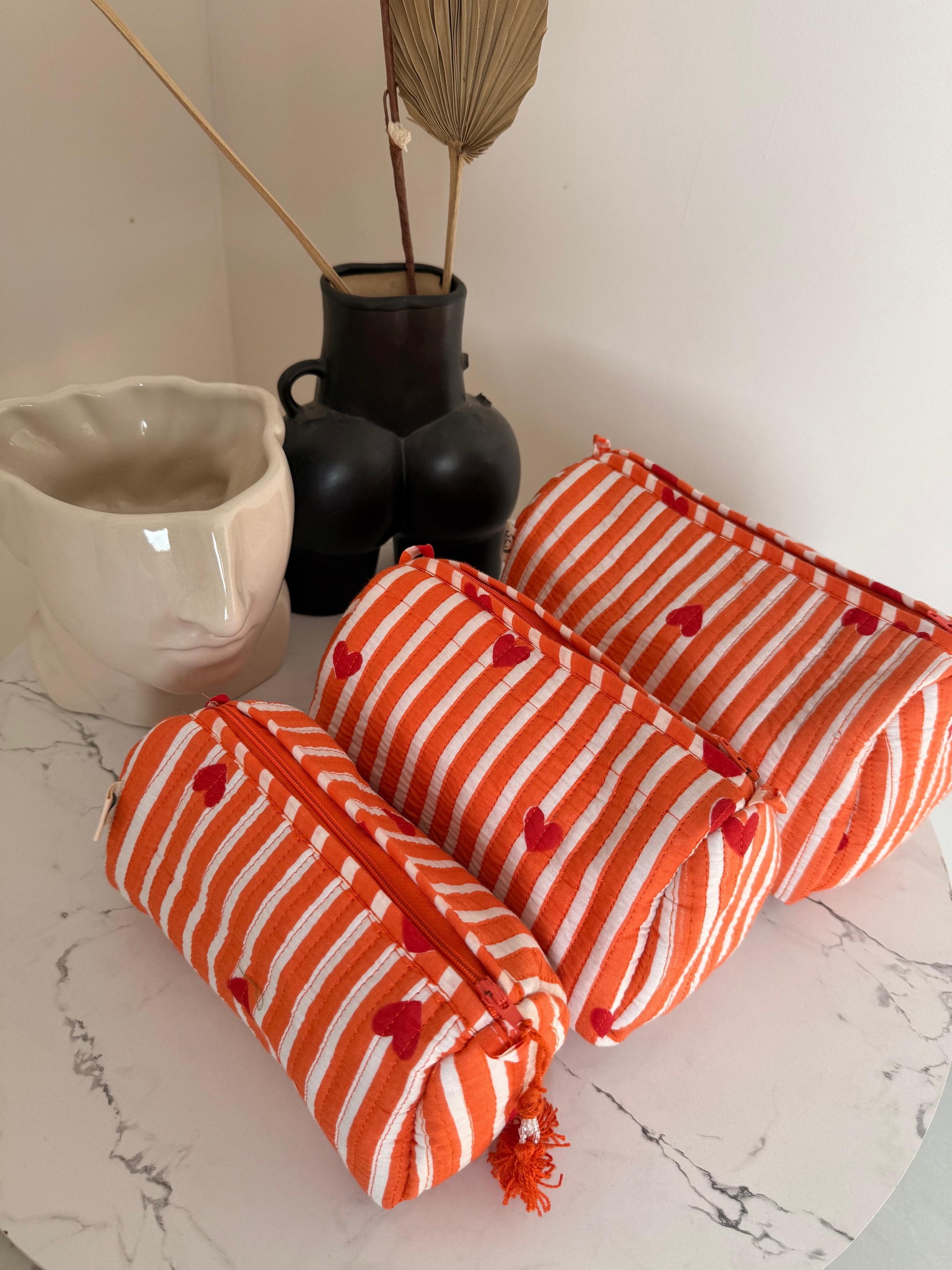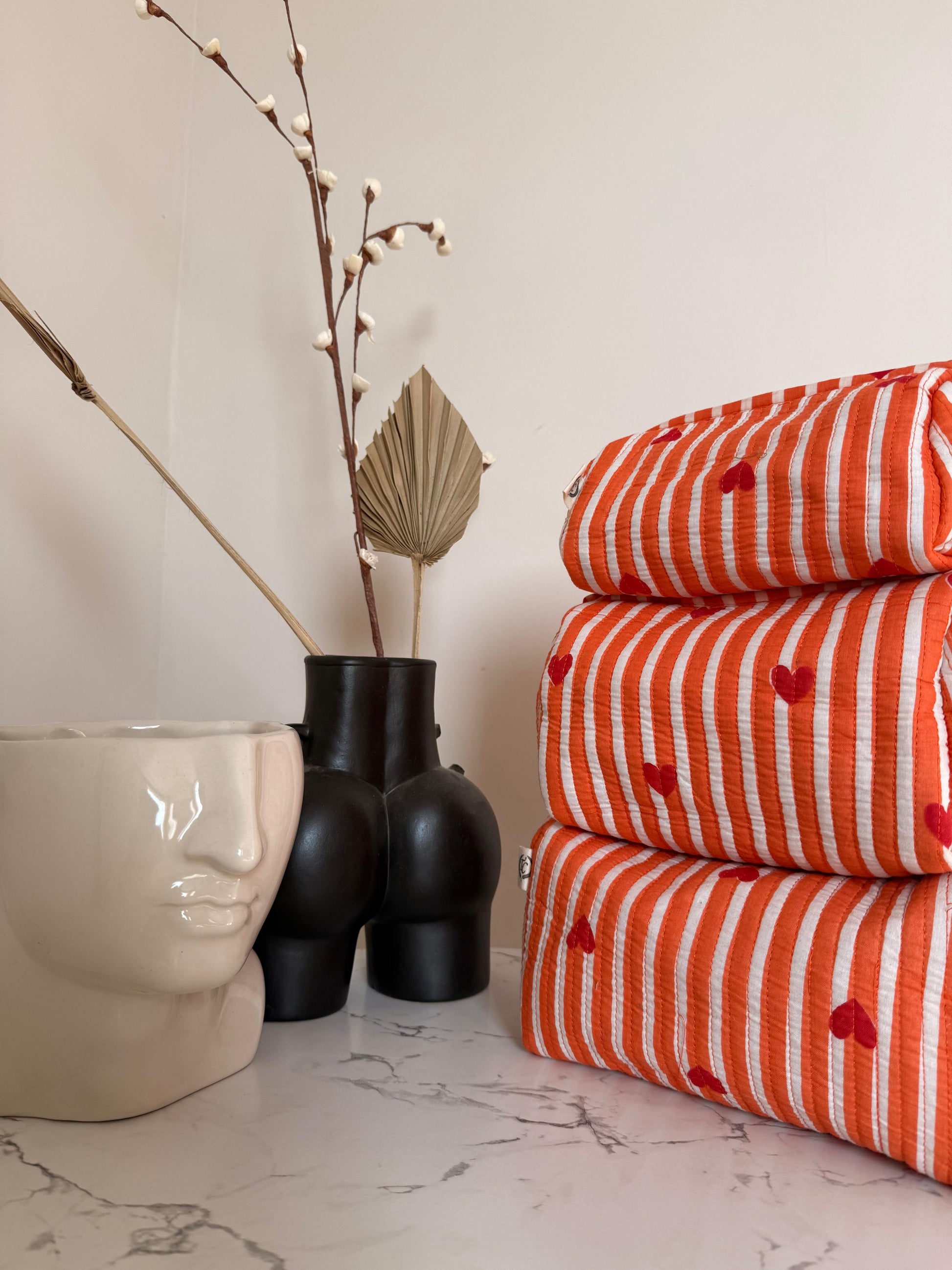 Add a touch of artisan elegance with our Hearts embroider Kantha Cotton Embroidered Toilteries pouches , crafted by skilled local artisans of India. This unique pouch features traditional Kantha stitching combined with intricate white cotton floral embroidery, creating a stunning monochrome contrast.