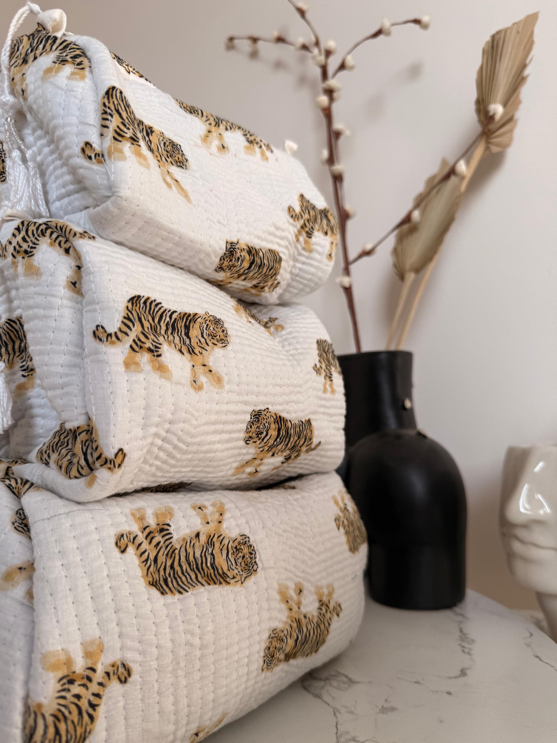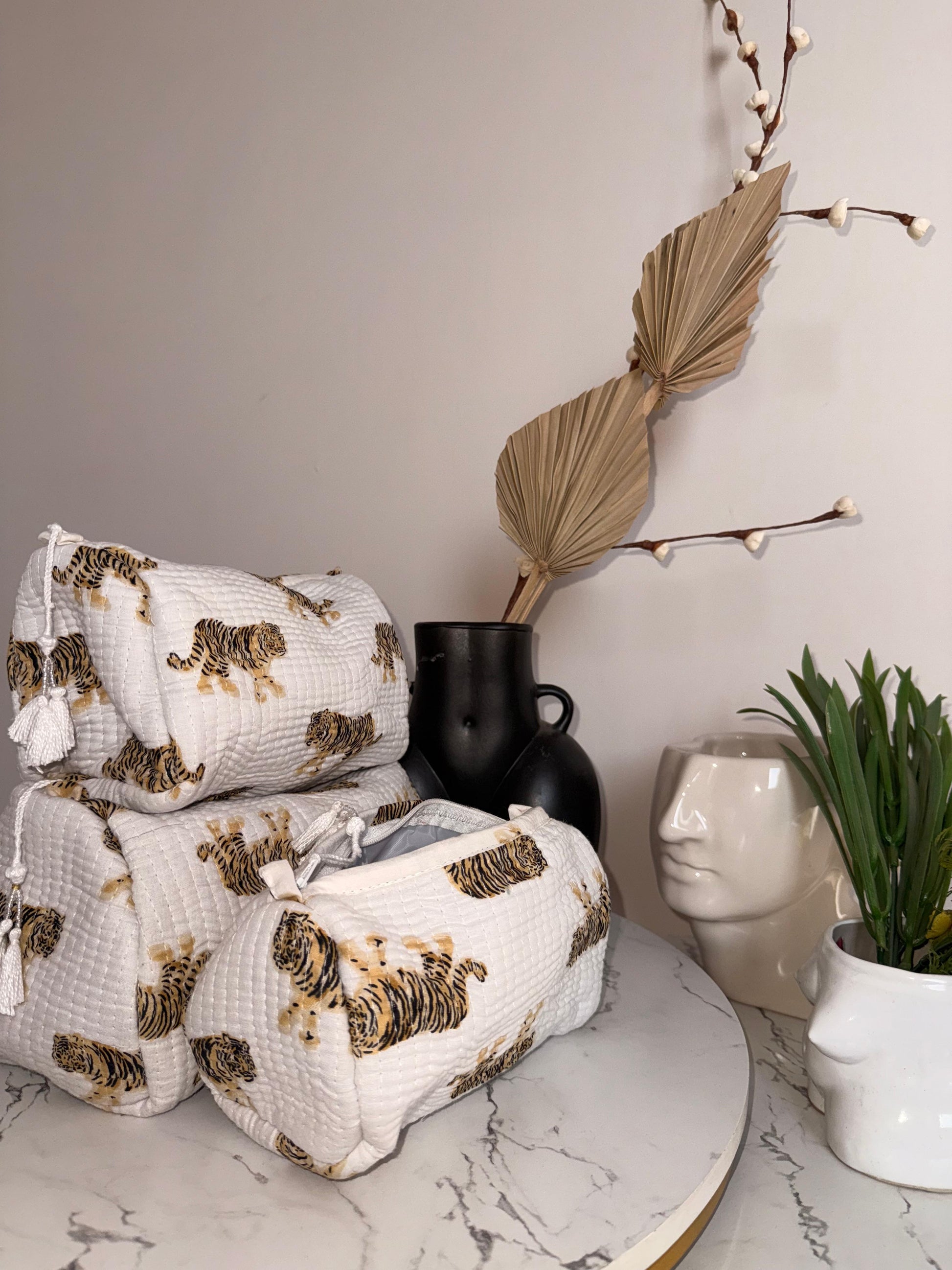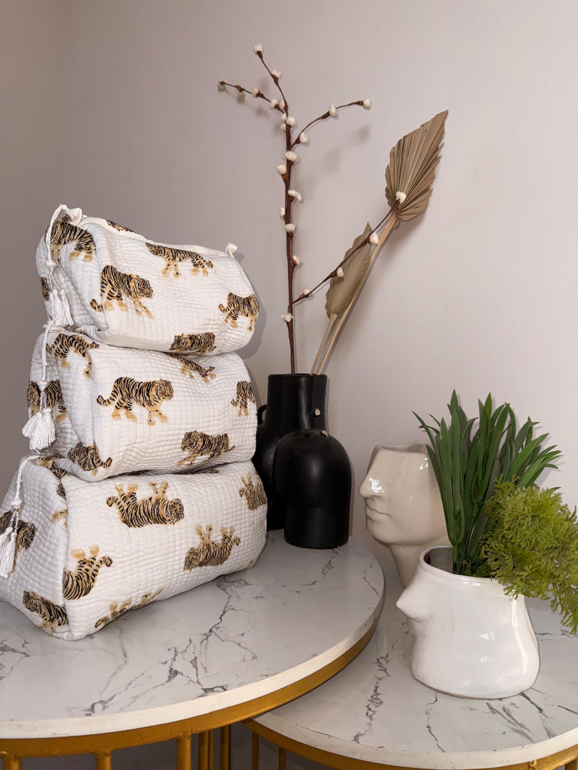 Add a touch of artisan elegance with our Hearts embroider Kantha Cotton Embroidered Toilteries pouches , crafted by skilled local artisans of India. This unique pouch features traditional Kantha stitching combined with intricate white cotton floral embroidery, creating a stunning monochrome contrast.